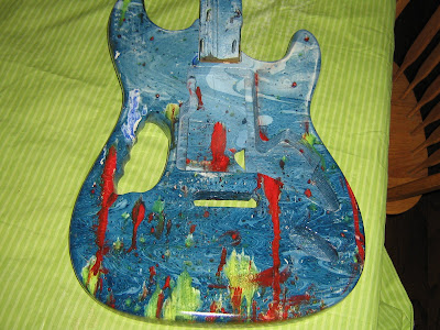 And finally collecting the supplies for the dying. The paints, Borax soap, a container large enough to submerge the guitar without touching any sides or the bottom, a plastic bag large enough to protect the container, and about a thousand gallons of water to float the paint on.